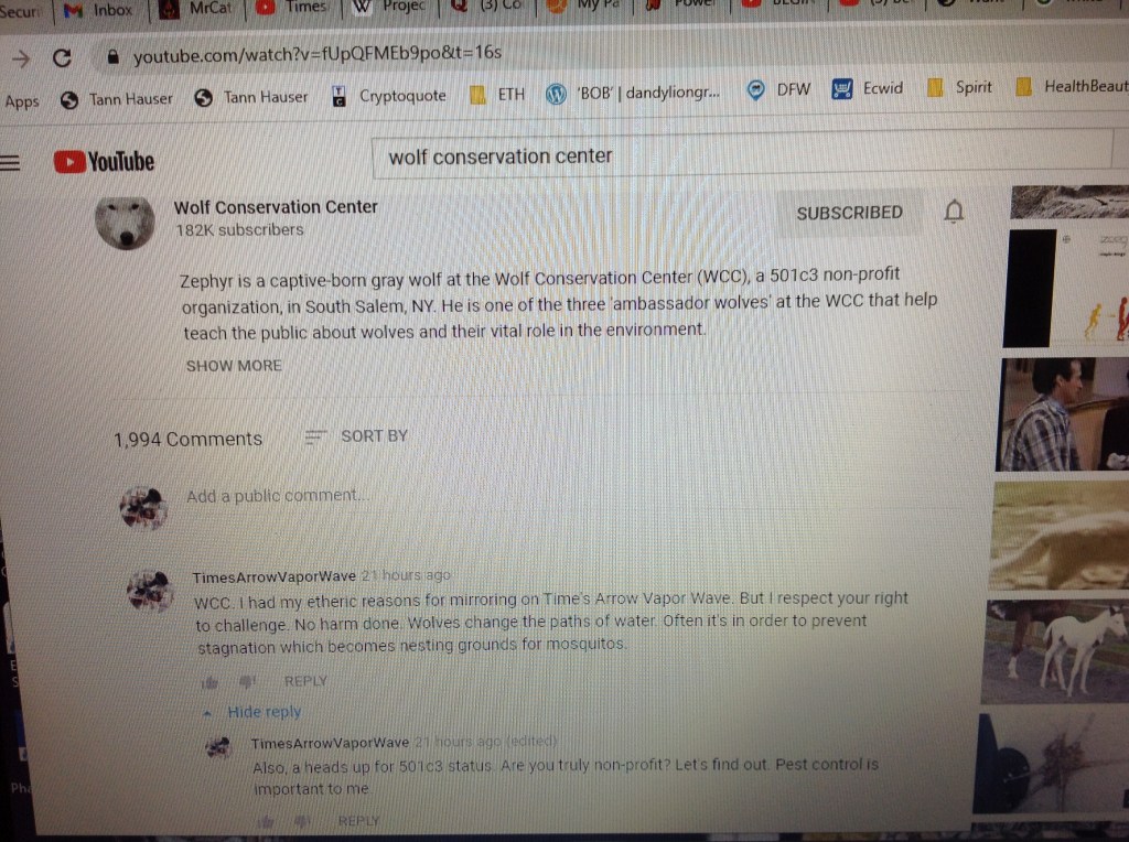Mirroring denied for Time’s Arrow Vapor Wave. TAVW notice: “WCC. I had my etheric reasons for mirroring on Time’s Arrow Vapor Wave. But I respect your right to challenge. No harm done. Wolves change the paths of water. Often it’s in order to prevent stagnation which becomes nesting grounds for mosquitos. Also, a heads up for 501c3 status. Are you truly non-profit? Let’s find out. Pest control is important to me.”