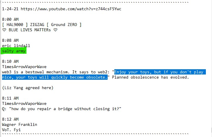 Oh, by the way… I’ve ripped that “C” sheet into long strips and am in the process of turning it into an Amish toothbrush rug with a lovely new cordage from Hobby Lobby. And on that note, CSAM (child sexual abuse material) won’t survive web3. I have this on good authority from my Brother and friend Dominic Williams. Thank you, Dom. vv